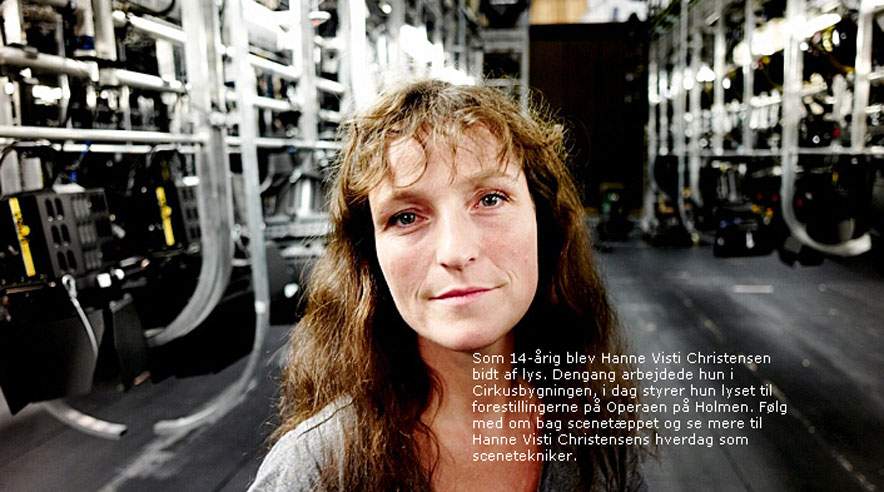 Forsiden NyhederOperaen - Kvinden bag lysetScenetekniker Hanne Visti Christensen tryller med kulisser og lys på Det Kongelige Teater. Kom med på besøg på hendes arbejdsplads. Hør og se mere her