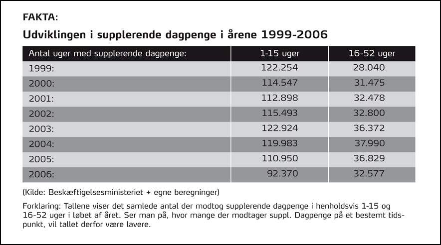 Fra 1999 til 2003 steg antallet af personer med supplerende dagpenge fra cirka 150.000 til 160.000. Herefter er det dog faldet til cirka 125.000 i 2006. Men det er især antallet af ledige med supplerende dagpenge i mindre end 15 uger, der er faldet.