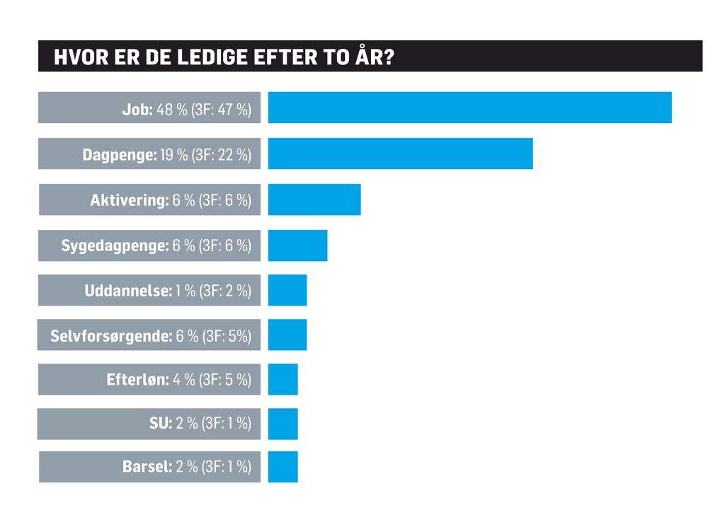 Kun lige knap halvdelen af ledige - 47 procent - er i arbejde igen et år efter, de er blevet ledige. Det viser tal fra Beskæftigelsesministeriets DREAM-data, som 3F's økonomer har set på. Efter to år er det ikke meget anderledes. Her er 48 procent i arbejde.