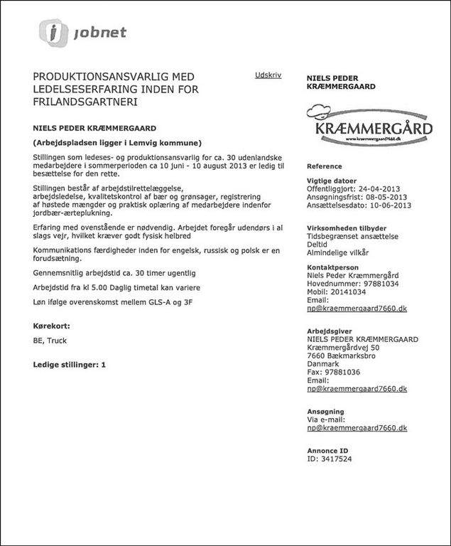 Bæravleren oplyser desuden, at stillingen har været besat af en ukrainsk mand de seneste fire år. I år kunne han ikke få arbejdstilladelse i Danmark med den begrundelse, at der er nok dansk arbejdskraft.