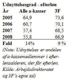 Onsdag viste tal og beregninger fra a-kassernes brancheorganisation, AK-Samvirke, at udnyttelsesgraden af efterlønnen har været støt faldende. Det gælder også blandt 3F’s medlemmer, men ikke i så høj grad.